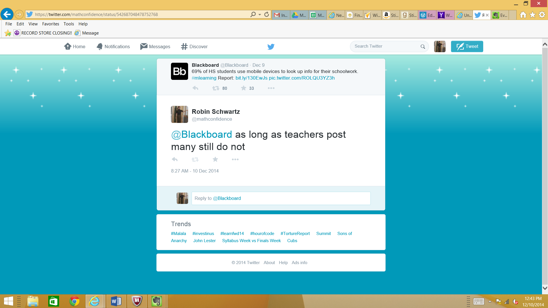 Uncategorized Teachers Please Post Homework!!! Link December 10, 2014 mathconfidence Leave a comment @Blackboard as long as teachers post many still do not — Robin Schwartz (@mathconfidence) December 10, 2014