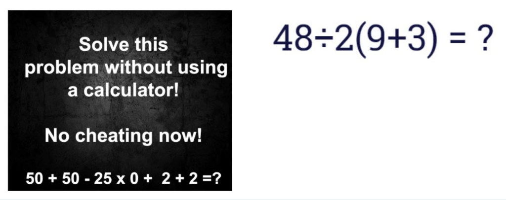 brain puzzler, brain teaser february 2021 brain puzzler solution February 22, 2021 mathconfidence Leave a comment The puzzles above are all about Order of Operations:50 + 50 – 25 x 0 + 2 + 250 + 50 – 0 + 2 + 210448 divided by 2(9 + 3)48 divided by 2 x 12Now go from left to right24 x 12 288