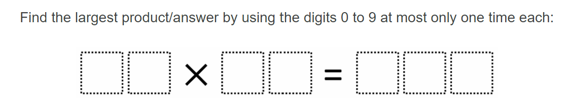 brain puzzler March 2023 Brain Puzzler Solution March 27, 2023 mathconfidence Leave a comment 54 x 18 = 972 As all the numbers in the 990s repeat a 9 and 989 and 988 also have repeating digits, the first number to check is 987. Count down from there checking each number for its factors.