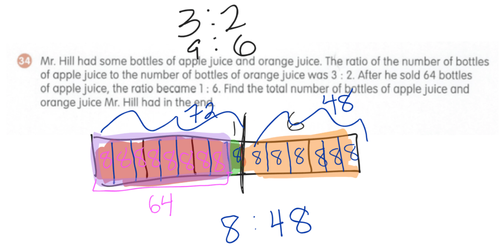 Mr. Hill had 8 bottles of apple juice and 48 bottles of orange juice in the end. This bar model shows that if we start with 3:2 and want 1:6 we can rewrite 3:2 as 9:6 so the 6’s match. This means the 8 boxes on the left that total 64 each represent 8 bottles so that the original 3:2 was really 72:48. After he sells 64 of the 72, he has 8 left and still has 48 orange juice bottles which simplifies to 1:6.