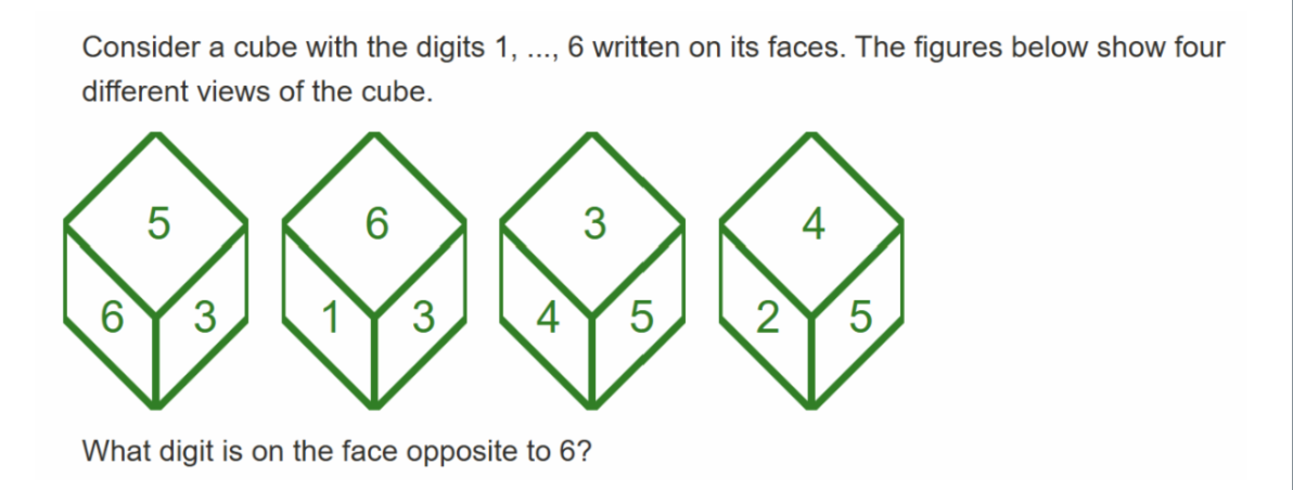 Looking at the first two cubes from left to right, the face opposite to the 6 cannot be a 1, 3 or 5 since they are immediately next to the 6. Also if we position Cube 2 so that 6 and 3 match up with Cube 1 then 5 and 1 are on opposite faces.